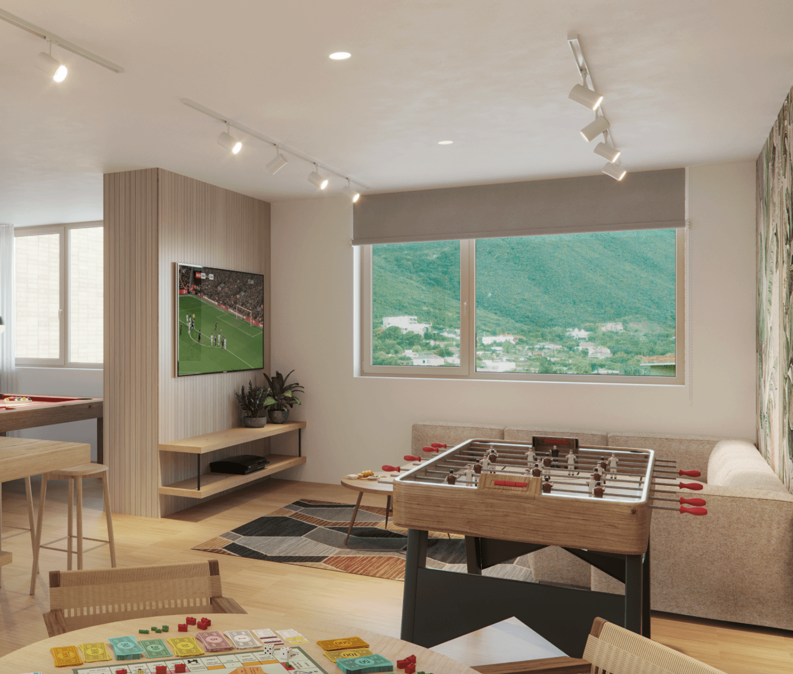 Las amenidades de Roble 700 se distribuyen estratégicamente a lo largo del proyecto para acompañar las distintas etapas de la vida cotidiana. En el nivel 3, el gimnasio y la ludoteca conforman un espacio pensado tanto para el bienestar físico como para la convivencia familiar, integrando actividad, juego y cuidado personal.